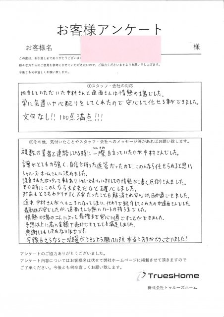 言葉がとても力強く、自信を持った返答だったので、この人なら任せられると思いトゥルーズホームさんに決めました。