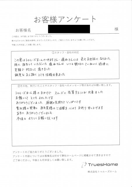 トゥルーズホーム様のおかげでスムーズに売買することが出来ました。