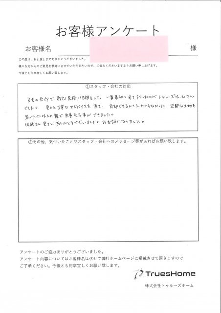 自宅の売却で数社見積もり依頼をしました。 その中で一番早く最初に来てくださったのがトゥルーズホームさんでした。 色々と丁寧なアドバイスを頂き、売却できるか分からなかった辺鄙な土地を思っていた以上の額で無事に売ることができました。 佐藤さん色々とありがとうございました。お世話になりました。 2022年3月4日