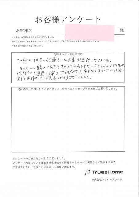 この度は担当の佐藤さんに大変お世話になりました。 マイホーム購入にあたり初めての分からないことばかりでしたが 佐藤さんの迅速、丁寧なご対応で不安もなくスムーズに引き渡し完了し 感謝しています。 ありがとうございました。 2022年3月17日