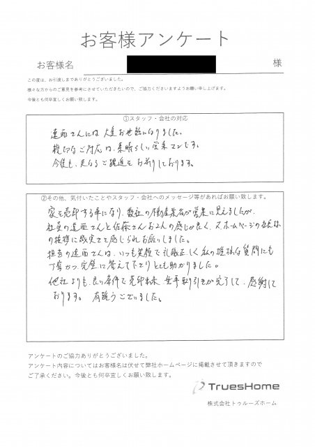 家を売却する事になり、数社の不動産業者が営業に見えましたが、社員の遠西さんと佐藤さんお2人の感じが良く、又ホームページの社長様の挨拶に誠実さを感じられお願いしました。