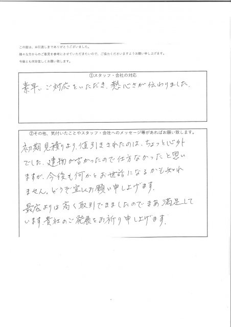 素早いご対応いただき、熱心さが伝わりました。 初回の見積りより値引きされたのはちょっと意外でした。 建物が古かったので仕方ないと思いますが今後もお世話になるかもしれません。 どうぞ、宜しくお願い致します。 最低価格より高く取引できましたので満足しています。 貴社の発展をお祈り申し上げます。 2022年6月2日