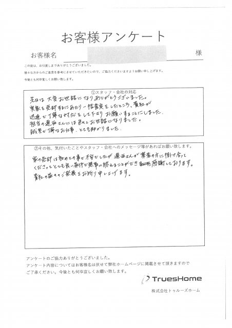 この度はお取引させて頂いたこと、 アンケートのご記入ありがとうございました。 数ある不動産業者の中から弊社を選んで頂き ご縁を頂けたことを大変感謝しております。 他社様よりも良い条件で希望に沿ったかたちで ご売却のご提案ができ喜んでいただけて良かったです。 お会いさせて頂いてから今日まで、 無事にご決済が終えることができ私も大変嬉しく思います。 今後とも何卒宜しくお願い致します。