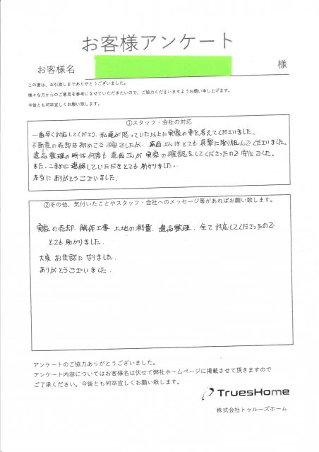 この度はお取引させて頂いたこと、 アンケートのご記入ありがとうございました。 数ある不動産業者の中から弊社を選んで頂き ご縁を頂けたことを大変感謝しております。 迅速かつお手間を取らせることなく 一括してご売却のお手伝いができ喜んでいただけて良かったです。 また、こまめに連絡を取らさせて頂き 安心してご決済を迎えることができ 私も大変嬉しく思っております。 今後とも何卒宜しくお願い致します。
