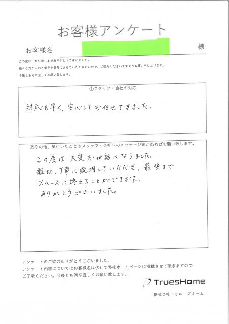 この度はお取引させて頂いたこと、 アンケートのご記入ありがとうございました。 数ある不動産業者の中から弊社を選んで頂き ご縁を頂けたことを大変感謝しております。 迅速かつスムーズに お手伝いができ喜んでいただけて 私も大変嬉しく思います。 今後とも何卒宜しくお願い致します。