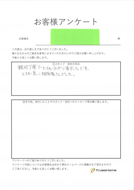 この度はお取引させて頂いたこと、 アンケートのご記入ありがとうございました。 数ある不動産業者の中から弊社を選んで頂き ご縁を頂けたことを大変感謝しております。 迅速かつスムーズに お手伝いができ喜んでいただけて 私も大変嬉しく思います。 今後とも何卒宜しくお願い致します。