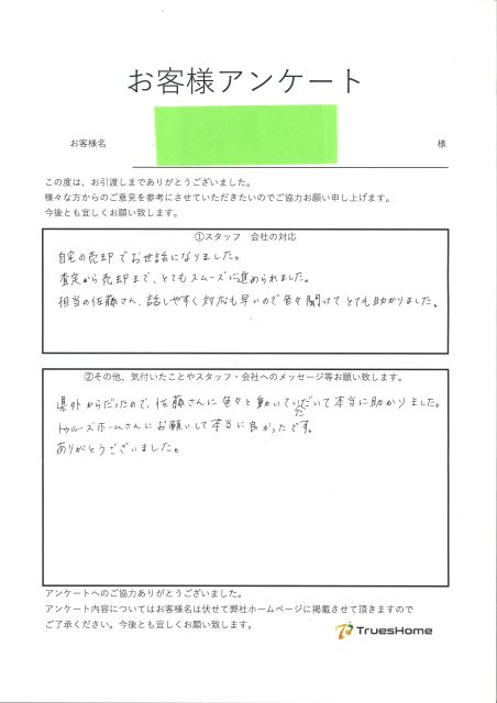 この度はアンケートとお引渡しまで ありがとうございました。 初めて査定させて頂いた際には 大手不動産会社含む多数の会社とお会いされていた中で 弊社を選んで頂き引渡しまで無事にできまして 嬉しく思います。 また、遠方でありながら 迅速に対応して頂きスムーズに引渡しできました。 今後とも宜しくお願い致します。