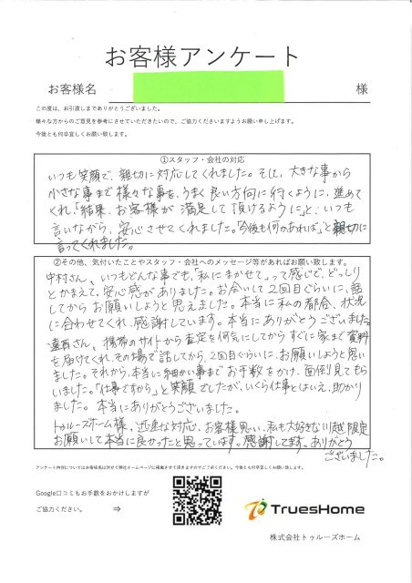 いつも笑顔で、親切に対応してくれました。そして大きな事から小さな事まで様々な事を、うまく良い方向に行くように、進めてくれ、「結果、お客様が満足して頂けるように」と、いつも言いながら、安心させてくれました。「今度も何かあれば」と親切に言ってくれました。中村さん、いつもどんな事でも、「私にまかせて」って感じでどっしりとかまえて、安心感がありました。お会いして2回目ぐらいに話してからお願いしようと思えました。本当に私の都合、状況に合わせてくれ、感謝しています。本当にありがとうございました。遠西さん、携帯のサイトから査定を何気にしてからすぐに家まで資料を届けてくれ、その場で話してから2回目ぐらいに、お願いしようと思いました。それから、本当に細かい事までお手数をかけ、面倒見てもらいました。「仕事ですから」と笑顔でしたが、いくら仕事とはいえ、助かりました。本当にありがとうございました。トゥルーズホーム様、迅速な対応、お客様思い、私も大好きな川越限定お願いして本当に良かったと思っています。感謝してます。ありがとうございました。