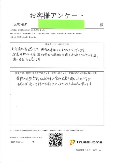 この度はお取引させて頂いたこと、 アンケートのご記入ありがとうございました。 数ある不動産業者の中から弊社を選んで頂き ご縁を頂けたことを大変感謝しております。 迅速にお手間なく 一括してご売却のお手伝いができ喜んでいただけて良かったです。 安心してご決済を迎えることができ 私も大変嬉しく思っております。 座って出来なかったことは、 弊社の力不足で申し訳ございませんでした。 今後さらに精進してご期待に応えられるようにしていきます。 今後とも何卒宜しくお願い致します。