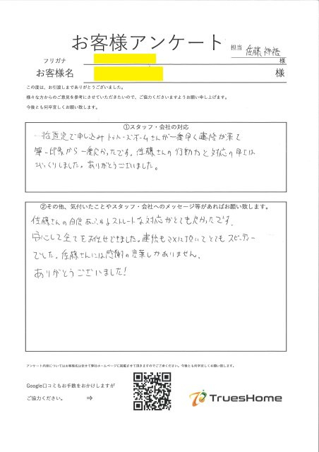 この度はアンケートのご記入ありがとうございました。 また、ローン完済手続きや お引渡し日は混み合っていて お時間かかってしまいましたが ご協力ありがとうございました。 迅速で正確な対応を心掛けている中で 良く思って頂き嬉しく思います。 最初のご訪問で 詳細な事情を聞かせて頂けたので 私としても二回目の訪問で 正確な金額や今後の流れなどの ご提案ができました。 今回は売却のお手伝いでしたが 今後、購入される機会があれば 是非、お声掛けください。 この度はありがとうございました。