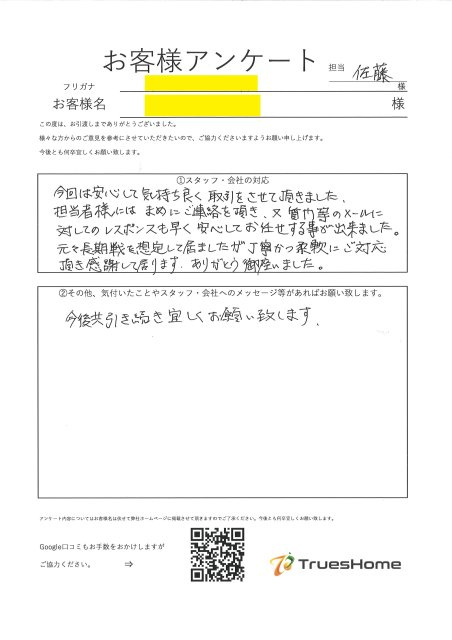 この度はアンケートのご協力ありがとうございました。 現在の自宅のご購入も弊社でお手伝いさせて頂き 購入、売却と約1年半にあたりお付き合いさせて頂きました。 無事にお引渡しができ、大変嬉しく思います。 不動産市場や売却状況から 色々とご提案させて頂いた中で その都度、お時間頂き 柔軟にご協力して頂いたので 無事にご成約と引渡しまで出来たと思います。 今後とも何かあればお気軽にご連絡ください。 この度はありがとうございました。