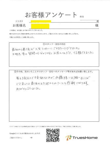 最初から最後まで大変ていねいにご対応いただきました。 不明点等の質問にも分かりやすくお応えいただき、信頼できました。 家を手放すことで不安もありましたが、佐藤様にお願いすることができ安心して最後の日を迎えられたことを感謝しております。 ありがとうございました。 2024年7月12日