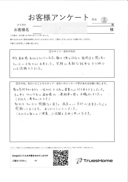 取引もスムーズに問題なく完了し満足のいく売却が出来ましたこと