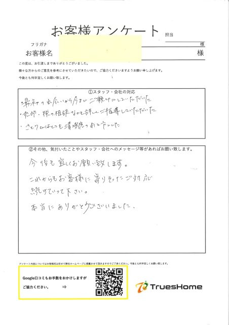 この度はアンケートのご記入ありがとうございます。 初めてお会いしてから約1年間お世話になりました。 当初は一括査定からのお問合せと お知り合いの業者様の中でご検討されていて ご納得のいく ご提案まで少し時間がかかってしまいましたが 何度もお時間をいただきまして 無事にお引渡しを迎えることができました。 ご自身での相続手続き、荷物撤去等 お忙しい中、大変だったと思いますが ご協力ありがとうございます。 また、数ある不動産業者様の中から 弊社を選んで頂きまして 本当にありがとうございました。 今後とも何卒宜しくお願い致します。