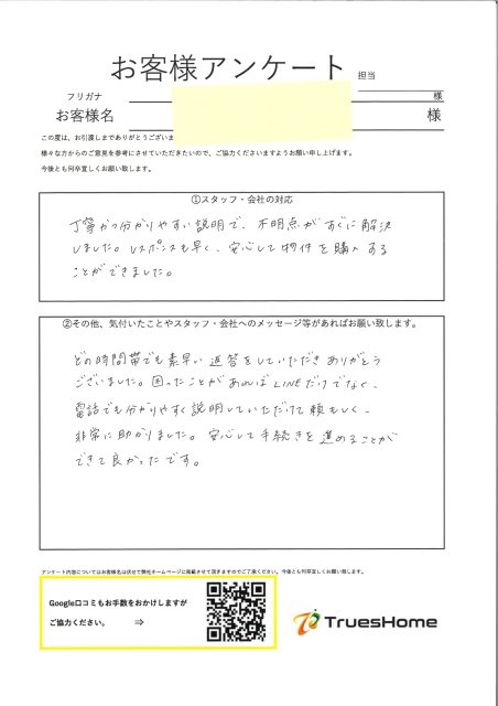 この度は、アンケートのご記入と 引き渡しまでありがとうございました。 迅速で誠実な対応を心掛けていますので ご意見、大変嬉しく思います。 最初にお会いしてから 引き渡しまで約4ヶ月間 諸手続きが色々と大変だったと思いますが 無事に引き渡しができました。 ありがとうございます。 また、不明点は 随時、確認していただきましたので 私も安心して手続き関係を することができました。 今後も色々とやり取りをさせて いただきますので 何卒宜しくお願い致します。